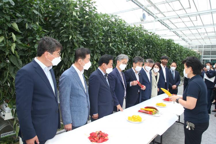 À̾î, ³ó»ê¾÷°æÁ¦À§¿øÈ¸ ÀÇ¿øµéÀº ÷´Ü À¯¸®¿Â½Ç¿¡ ICT¸¦ Á¢¸ñÇÑ ½º¸¶Æ®ÆÊ ±â¼úÀ» ÅëÇØ ÆÄÇÁ¸®Ä«¸¦ »ý»êÇϰí ÀÖ´Â ÀüºÏ¿µ³óÁ¶ÇÕ¹ýÀÎÀ» ¹æ¹®ÇØ ³ó°¡ÀÇ ¾Ö·Î»çÇ×À» ûÃëÇÏ°í ¾ÕÀ¸·Î µµ³» ½º¸¶Æ®ÆÊÀÇ ¹ßÀü ¹æ¾ÈÀ» ³íÀÇÇß´Ù.