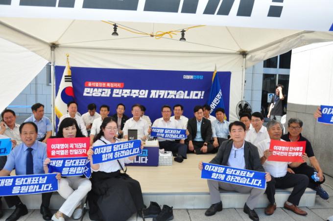 ¹®»óÇÊ À§¿øÀåÀ» ºñ·ÔÇÑ ±¤ÁÖ ºÏ±¸°© Áö¿ª ´ç¿ø 25¸íÀº ÀÌÀç¸í ´ç ´ëÇ¥ ´Ü½ÄÅõÀï ÁöÁö ¹æ¹® ÈÄ ¡®¹Î»ý°ú ¹ÎÁÖÁÖÀǸ¦ ÆÄź ³»°í ±¹¹ÎÀ» ÀûÀ¸·Î µ¹¸®´Â À±¼®¿ Á¤ºÎ¸¦ ±ÔźÇϰí, ±¹¹ÎÀÌ Áû¾îÁø ¹Î»ýÀÇ ±æÀ» ´ë½ÅÇØ »çÁï»ýÀÇ °¢¿À¸¦ Áû¾îÁø ÀÌÀç¸í ´õºÒ¾î¹ÎÁÖ´ç ´ëÇ¥ÀÇ ´Ü½ÄÅõÀïÀ» ÁöÁöÇÏ´Â ¼º¸í¡¯À» ¹ßÇ¥ÇßÀ¸¸ç, ÀÌ ÀÚ¸®¿¡´Â ±èµÎ°ü(°æ³² ¾ç»ê½ÃÀ»), Àü¿ë±â(ºñ·Ê´ëÇ¥) ±¹È¸ÀÇ¿øµµ ÇÔ²²Çß´Ù.