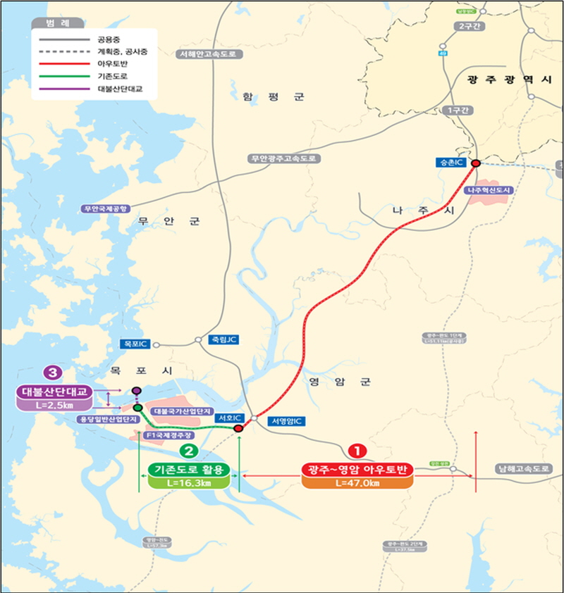 »ç¾÷ºñ´Â ±¤ÁÖ~¿µ¾Ï Ãʰí¼Óµµ·Î 2Á¶ 6õ¾ï ¿ø, ´ëºÒ»ê´Ü´ë±³ 1õ900¾ï ¿ø µî ÃÑ 2Á¶ 7õ900¾ï ¿øÀÌ ¼Ò¿äµÉ ¿¹Á¤ÀÌ´Ù. ±¤ÁÖ~¿µ¾Ï Ãʰí¼Óµµ·Î´Â ¡®Á¦3Â÷ °í¼Óµµ·Î °Ç¼³°èȹ(2026~2030)¡¯, ´ëºÒ»ê´Ü´ë±³´Â ¡®»ê¾÷´ÜÁö ÁøÀÔµµ·Î °èȹ¡¯¿¡ ¹Ý¿µÇØ Á¤ºÎ Áö¿øÀ» À̲ø¾î³¾ °èȹÀÌ´Ù.