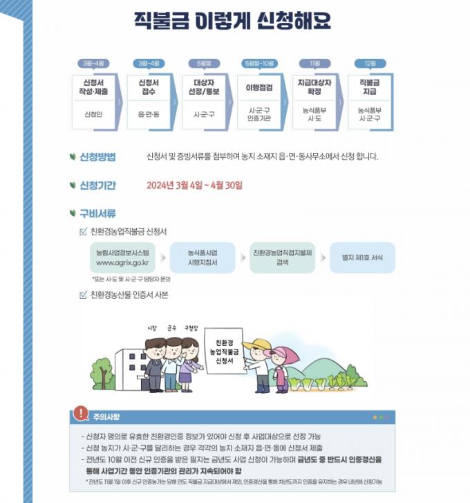 Áö±Þ ´ë»óÀº »ç¾÷ ±â°£(2023³â 11~2024³â 10¿ù) ģȯ°æÀÎÁõÀ» À¯ÁöÇϰí 5¿ù¿¡¼ 10¿ù±îÁö ģȯ°æ³ó¾÷ ½Çõ Áؼö»çÇ× ÀÌÇà ¿©ºÎ¸¦ ÀÎÁõ±â°üÀÌ Á¡°ËÇØ ÀûÇÕÀ¸·Î Å뺸¹ÞÀº °æ¿ì´Ù. 12¿ù¿¡ Á÷ºÒ±ÝÀ» Áö±ÞÇÒ °èȹÀÌ´Ù.´Ù¸¸ »ç¾÷ ±â°£ ³» ģȯ°æÀÎÁõ ±â°£ÀÌ ¸¸·á ¿¹Á¤ÀÎ ³ó¾÷ÀÎÀº ÀÎÁõÀÌ ¸¸·áµÇ±â 2°³¿ù Àü¿¡ °»½Å ½ÅûÀ» ÇØ¾ß Çϰí, °»½ÅµÇÁö ¾ÊÀ¸¸é Á÷ºÒ±ÝÀÌ Áö±ÞµÇÁö ¾Ê´Â´Ù.