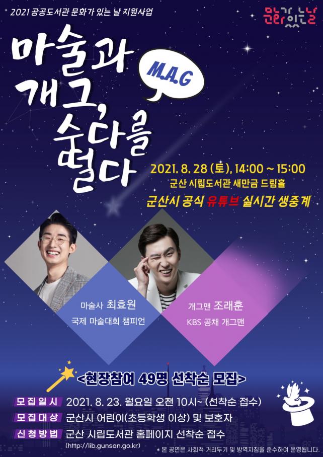 À̹ø °ø¿¬Àº KBS °øÃ¤ Äڹ̵ð¾ð Á¶·¡Èưú ±¹Á¦ ¸¶¼ú ´ëȸ èÇǾð ÃÖÈ¿¿øÀÌ ÄáÆ®¿Í ½½·¦½ºÆ½ Äڹ̵ð, Âü¿©Çü ¸¶¼ú µîÀ» ÇÔ²² Áñ±æ ¼ö ÀÖ´Â Äڹ̵𠽺Å丮ÅÚ¸µ °ø¿¬ÀÌ´Ù. Äڷγª19·Î ÁöÄ£ ½Ã¹ÎµéÀÇ ¸¶À½À» °³±×¿Í ¸¶¼ú·Î Èú¸µ½ÃÄÑÁÙ ¹«´ë·Î ¿î¿µÇÒ ¿¹Á¤ÀÌ´Ù.
