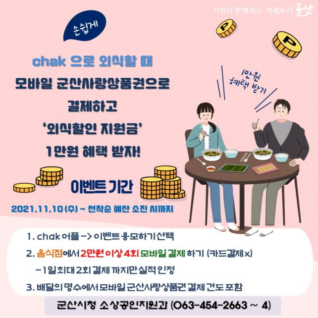 ¿Ü½ÄÇÒÀÎ Çà»ç´Â ¡ºÁö¿ª»óǰ±Ç chak¡»¾ÛÀ» ÅëÇÏ¿© ½ÅûÇÒ ¼ö ÀÖ°í, ¸ð¹ÙÀÏ ±º»ê»ç¶û»óǰ±Ç °¡¸ÍÁ¡ Áß ¾÷Á¾ÀÌ À½½ÄÁ¡¾÷ÀÎ °¡¸ÍÁ¡°ú 1ÀÏ ÃÖ´ë 2ȸ °áÁ¦±îÁö¸¸ ½ÇÀûÀ¸·Î Æ÷ÇÔ µÈ´Ù.