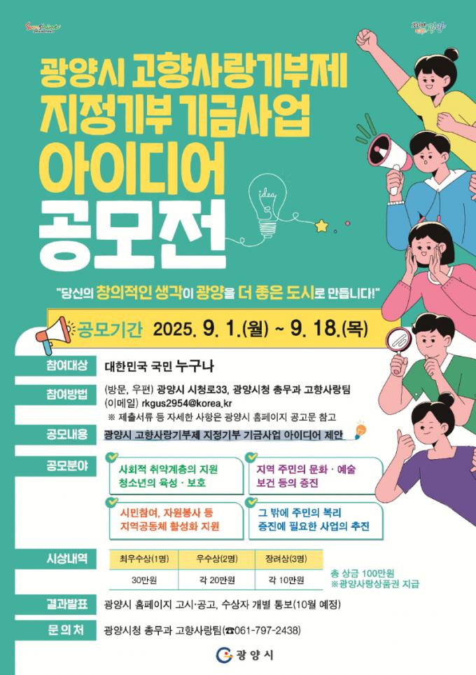 Á¦ÃâµÈ ¾ÆÀ̵ð¾î´Â ±¤¾ç½Ã °íÇâ»ç¶û±â±Ý¿î¿ë½ÉÀÇÀ§¿øÈ¸ÀÇ ½É»ç¸¦ °ÅÃÄ ¼ö»óÀÛÀ¸·Î ¼±Á¤µÈ´Ù. ½Ã»óÀº ÃÖ¿ì¼ö 1¸í(30¸¸ ¿ø), ¿ì¼ö 2¸í(°¢ 20¸¸ ¿ø), Àå·Á 3¸í(°¢ 10¸¸ ¿ø)À¸·Î ÃÑ 6¸í¿¡°Ô ±¤¾ç»ç¶û»óǰ±ÇÀ» Áö±ÞÇÑ´Ù. ½É»ç °á°ú´Â 10¿ù Áß ±¤¾ç½Ãû ´©¸®Áý(ȨÆäÀÌÁö) °í½Ã¡¤°ø°í¶õÀ» ÅëÇØ ¹ßÇ¥µÉ ¿¹Á¤ÀÌ´Ù.