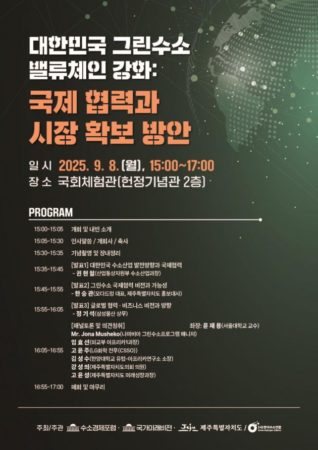 ±¹È¸ ¼ö¼Ò°æÁ¦Æ÷·³(´ëÇ¥ÀÇ¿ø ÀÌÁ¾¹è¡¤Á¤ÅÂÈ£ ÀÇ¿ø)°ú ±¹È¸ ±¹°¡¹Ì·¡ºñÀüÆ÷·³(´ëÇ¥ÀÇ¿ø Á¶Á¤½Ä ÀÇ¿ø), Á¦ÁÖµµ´Â 8ÀÏ ¿ÀÈÄ 3½Ã ±¹È¸Ã¼Çè°ü(ÇåÁ¤±â³ä°ü 2Ãþ)¿¡¼ ¡®´ëÇѹα¹ ±×¸°¼ö¼Ò ¹ë·ùüÀÎ °È¸¦ À§ÇÑ Á¤Ã¥Åä·Ðȸ¡¯¸¦ °øµ¿ °³ÃÖÇÑ´Ù.
