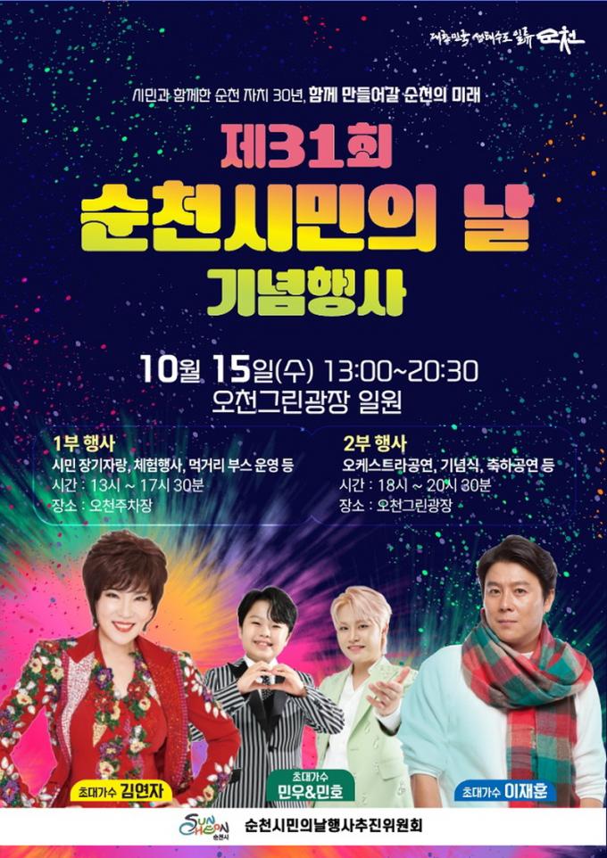 Á¦31ȸ ¼øÃµ½Ã¹ÎÀÇ ³¯ ÃàÇÏ °ø¿¬ Çdz¯·¹·Î Äð ÀÌÀçÈÆ, ·¹Àüµå °¡¼ö ±è¿¬ÀÚ, Æ®·ÎÆ®°è ½Åµ¿À¸·Î ¶°¿À¸£°í Àִ Ȳ¹ÎÈ£, ±×ÀÇ ÇüÀÌÀÚ ¸®Æ²½ÎÀÌ ¹Î¿ì °¡¼ö°¡ Ã⿬, ´Ù¾çÇÑ ÃàÇÏ °ø¿¬ÀÌ ÁøÇàµÇ°í 28¸¸ ¼øÃµ½Ã¹ÎÀÌ ÇÔ²² Áñ±â´Â È­·ÁÇÑ ºÒ²É¼î°¡ °¡À» ¹ãÇÏ´ÃÀ» ¼ö³õÀ¸¸ç ½Ã¹Îµé¿¡°Ô °¨µ¿ÀÇ ¼ø°£À» ¼±»çÇÒ °èȹÀÌ´Ù. °³ÀÎ µ¾ÀÚ¸®¸¦ ÁöÂüÇÏ¸é ´õ Æí¾ÈÇÏ°Ô °ü¶÷ÇÒ ¼ö ÀÖ´Ù.