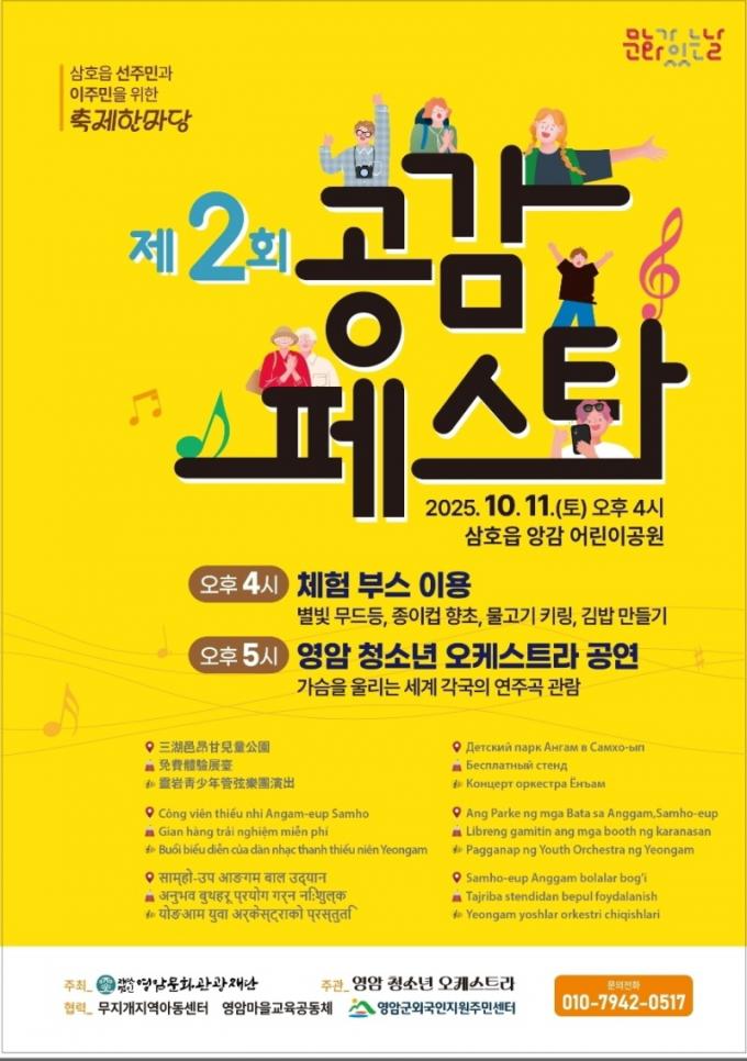 À̹ø Çà»ç´Â »ê¾÷´ÜÁö ³» ´Ù¹®È°¡Á¤ ¹× ÀÌÁֹεé°úÀÇ ¹®È¼ÒÅëÀ» ÅëÇØ Á¤¼Àû À§·Î¿Í »îÀÇ È°·ÂÀ» Áö¿øÇϰí, ¿µ¾Ï±º û¼Ò³âÀÇ ¿¬ÁÖ È°µ¿ ¿ª·® °È ¹× Áö¿ª¹®È¿¹¼ú Ȱ¼ºÈ¸¦ ¸ñÇ¥·Î Çϰí ÀÖ´Ù. ¿ÀÈÄ 4½ÃºÎÅÍ º°ºû ¹«µåµî, Á¾ÀÌÄÅ ÇâÃÊ, ¹°°í±â ۸µ ¸¸µé±â, ±è¹ä ¸¸µé±â µî ´Ùä·Î¿î ÇÁ·Î±×·¥ÀÌ ÁغñµÇ¾î ÀÖÀ¸¸ç, ¿ÀÈÄ 5½Ã¿¡´Â ¿µ¾Ï û¼Ò³â ¿ÀÄɽºÆ®¶óÀÇ ¿¬ÁÖ¸¦ ¼±º¸ÀδÙ.