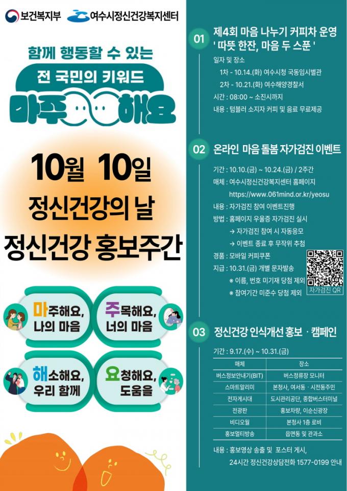 ¶ÇÇÑ ¿Â¶óÀÎ ¸¶À½ µ¹º½ ÀÚ°¡°ËÁø À̺¥Æ®µµ ÇÔ²² ¿î¿µµÈ´Ù. 10¿ù 10ÀϺÎÅÍ 24ÀϱîÁö ¿©¼ö½ÃÁ¤½Å°Ç°º¹Áö¼¾ÅÍ ´©¸®Áý(https://www.061mind.or.kr/yeosu)¿¡¼ ¿ì¿ïÁõ ÀÚ°¡°ËÁø¿¡ Âü¿©Çϸé ÀÚµ¿ ÀÀ¸ðµÇ¸ç À̺¥Æ® Á¾·á ÈÄ Ãß÷À» ÅëÇØ ¸ð¹ÙÀÏ Ä¿ÇÇ ÄíÆùÀ» ÁõÁ¤ÇÑ´Ù.