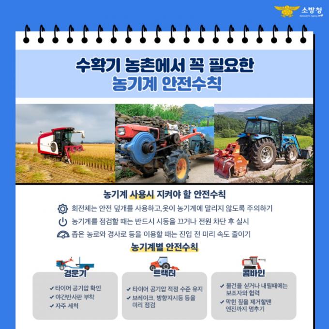 ¼øÃµ¼Ò¹æ¼´Â »ç°í ¿¹¹æÀ» À§ÇØ ¡ã³ó±â°è »ç¿ë Àü¡¤ÈÄ Ã¶ÀúÇÑ Á¡°Ë ¡ãÀ½ÁÖ ÈÄ ¿îÇà ±ÝÁö ¡ã°æ»çÁø ³ó·Î¡¤ÃâÀÔ·Î À̵¿ ½Ã °¨¼Ó ¹× ÁÖº¯ È®ÀÎ ¡ã¾ß°£ ÁÖÇà ½Ã ¹Ý»çÆÇ ºÎÂø¡¤¹æÇâÁö½Ãµî Ȱ¿ë ¡ãµµ·Î ¿îÇà ½Ã µµ·Î±³Åë¹ý Áؼö ¡ã³óÀÛ¹° °úÀû ±ÝÁö ¡ãÀÛ¾÷º¹Àº ¼Ò¸Å³ª ¿ÊÀÚ¶ôÀÌ Á¶¿©Áø ÇüÅÂ Âø¿ë µîÀ» °Á¶Çß´Ù.