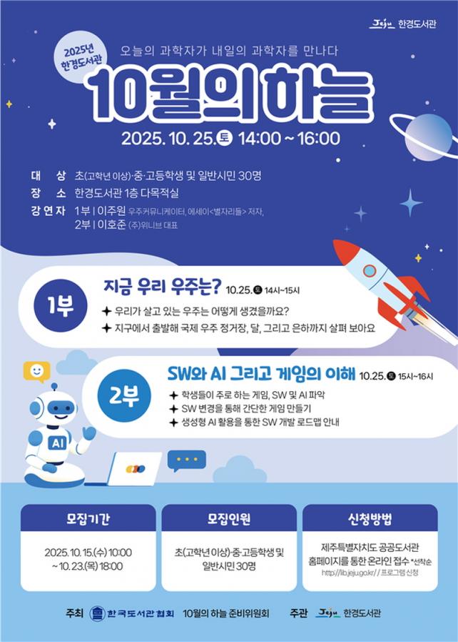 Âü°¡ ½ÅûÀº 10¿ù 15ÀÏ(¼ö) 10½ÃºÎÅÍ Á¦ÁÖÆ¯º°ÀÚÄ¡µµ °ø°øµµ¼­°ü ´©¸®Áý(https://www.jeju.go.kr/lib)¢¡Çà»ç/ÇÁ·Î±×·¥¢¡µµ¼­°ü ÇÁ·Î±×·¥ ½ÅûÀ» ÅëÇØ °¡´ÉÇϸç, ±âŸ ÀÚ¼¼ÇÑ »çÇ×Àº ÇѰ浵¼­°ü(¢Ï728-8602)À¸·Î ¹®ÀÇÇÏ¸é µÈ´Ù.