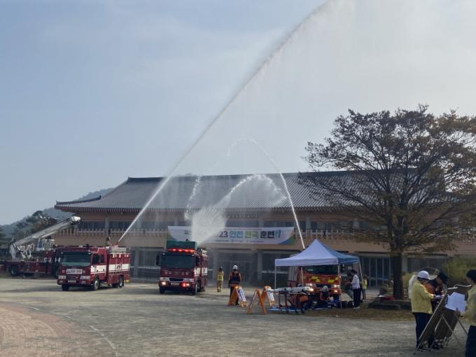 ³²±¸¿Í °ü°è±â°ü Âü¼®ÀÚ 300¿©¸íÀº ÃâÀÔ±¸ ºØ±«¿Í ÁöÁø ¿©ÆÄ·Î °Ç¹° 1Ãþ ±â°è½Ç¿¡¼ ÈÀç°¡ ¹ß»ýÇØ 2Ãþ °Ç¹° Àüü·Î ºÒ±æÀÌ È®»êÇÏ´Â »óȲ¿¡¼ Å»Ãⱸ È®º¸¿Í ÈÀç Áø¾Ð µî Ãʱ⠴ëÀÀ¿¡ ³ª¼´Â °úÁ¤À» ÈÆ·ÃÇÑ´Ù.