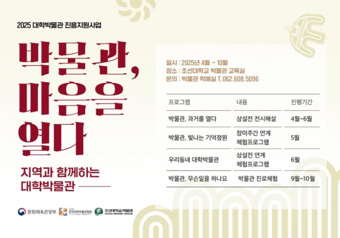 Á¶¼±´ëÇб³ ¹Ú¹°°üÀº (»ç)Çѱ¹´ëÇйڹ°°üÇùȸ°¡ ÁÖ°üÇÏ´Â ¡®2025 ´ëÇйڹ°°ü ÁøÈïÁö¿ø»ç¾÷¡¯ÀÇ ÀÏȯÀ¸·Î ¡®¡¸¹Ú¹°°ü, ¸¶À½À» ¿´Ù¡¹-Áö¿ª°ú ÇÔ²²ÇÏ´Â ´ëÇйڹ°°ü-¡¯ ÇÁ·Î±×·¥À» ¼ºÈ²¸®¿¡ ¸¶¹«¸®Çß´Ù.