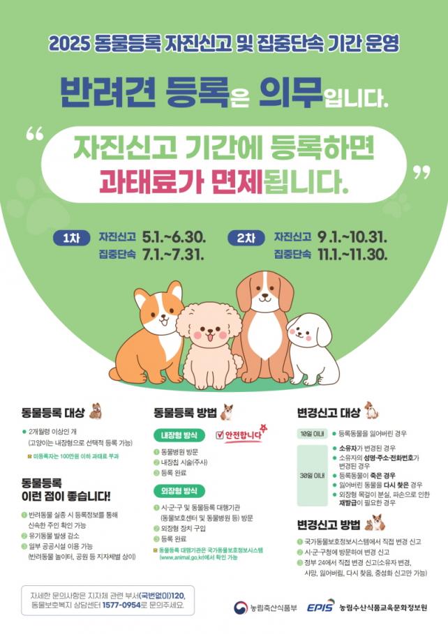 ÇöÇà µ¿¹°º¸È£¹ý¿¡ µû¸£¸é, ¹Ý·Á ¸ñÀûÀ¸·Î ±â¸£´Â »ýÈÄ 2°³¿ù ÀÌ»óÀÇ °³ ¼ÒÀ¯ÀÚ´Â ¹Ýµå½Ã µ¿¹°µî·ÏÀ» ¸¶ÃÄ¾ß ÇÑ´Ù. ¶ÇÇÑ, µî·Ï ÀÌÈÄ ¹Ý·Áµ¿¹°À» ÀÒ¾î¹ö·ÈÀ» ¶§´Â 10ÀÏ À̳»¿¡, ¼ÒÀ¯ÀÚ°¡ ¹Ù²î°Å³ª ¹Ý·Áµ¿¹°ÀÌ »ç¸ÁÇÏ´Â µî Á¤º¸ º¯°æÀÌ ÇÊ¿äÇÒ °æ¿ì 30ÀÏ À̳»¿¡ º¯°æ ½Å°í¸¦ ¿Ï·áÇØ¾ß ÇÑ´Ù. À̸¦ ÁöŰÁö ¾ÊÀ¸¸é ÃÖ´ë 60¸¸¿ø ÀÌÇÏÀÇ °úÅ·ᰡ ºÎ°úµÈ´Ù.