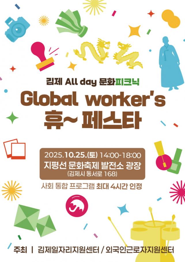 ½Ã´Â ¿À´Â 25ÀÏ ¿ÀÈÄ 2½ÃºÎÅÍ 6½Ã±îÁö ¿äÃ̵¿¿¡ À§Ä¡ÇÑ ÁöÆò¼±¹®ÈÃàÁ¦¹ßÀü¼Ò ±¤Àå(±èÁ¦½Ã µ¿¼·Î 168)¿¡¼ ¿Ü±¹ÀαٷÎÀÚ¿Í ½Ã¹ÎÀÌ ÇÔ²² ¾î¿ï¸®´Â ¹®È±³·ù ÇѸ¶´ç ¡°±èÁ¦ All day ¹®ÈÇÇÅ©´Ð – Global worker¡¯s ÈÞ~Æä½ºÅ¸¡±¸¦ °³ÃÖÇÑ´Ù°í ¹àÇû´Ù.