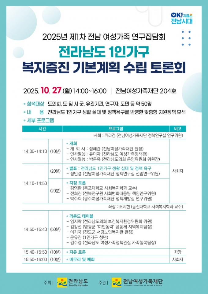 À̹ø Åä·Ðȸ´Â¡¸Àü¶ó³²µµ 1Àΰ¡±¸ º¹ÁöÁõÁø ±âº»°èȹ ¼ö¸³ ¿¬±¸¡¹ÀÇ ÀÏȯÀ¸·Î ±âȹµÇ¾ú´Ù. Åä·Ðȸ¿¡¼´Â µµ³» ±ÞÁõÇÏ´Â 1Àΰ¡±¸ÀÇ Æ¯¼º°ú Á¤Ã¥ ¿å±¸¿¡ °üÇÑ ½ÇÅÂÁ¶»ç °á°ú¸¦ °øÀ¯Çϰí, 1Àΰ¡±¸ º¹ÁöÁõÁøÀ» À§ÇÑ Á¤Ã¥ Áö¿ø¹æÇâ¿¡ °üÇØ ÀǰßÀ» ³ª´ ¿¹Á¤ÀÌ´Ù.