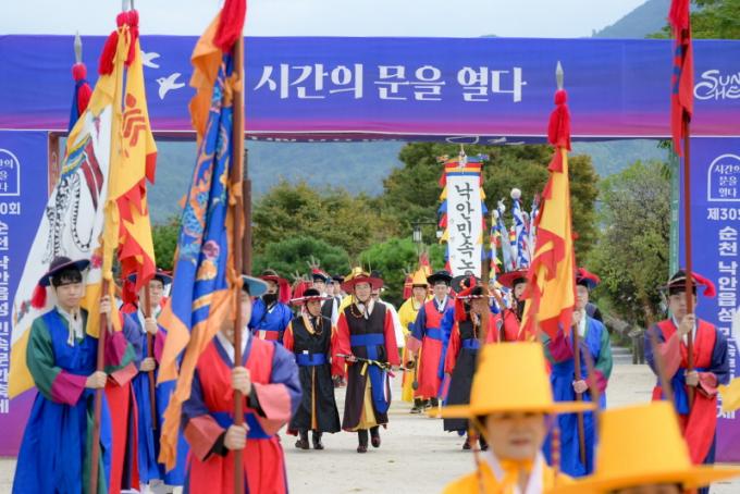 ¡®¼øÃµ ³«¾ÈÀ¾¼º, ½Ã°£ÀÇ ¹®À» ¿­´Ù¡¯¶ó´Â ÁÖÁ¦·Î ¿­¸° À̹ø ÃàÁ¦´Â 17ÀÏ ¿ÀÈÄ ³«¾È±º¼ö ºÎÀÓÇà·Ä°ú ±º¾Ç´ë ÇàÁøÀ¸·Î ½ÃÀÛµÆÀ¸¸ç, Á¶¼±½Ã´ë·ÎÀÇ ¹®À» Ȱ¦ ¿©´Â »ó¡ÀûÀÎ ÆÛÆ÷¸Õ½º¸¦ ¼±º¸ÀÎ °³¸·½ÄÀº ³ë°ü±Ô ¼øÃµ½ÃÀåÀ» ºñ·ÔÇÑ ÁÖ¿ä ³»ºóµéÀÌ Âü¿©ÇÑ °¡¿îµ¥ ÁøÇàµÆ´Ù.