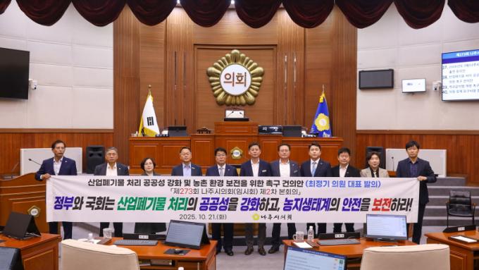 [È£³²µµ¹Î½Å¹® = ÀÓÀ±Áø ±âÀÚ] ³ªÁÖ½ÃÀÇȸ(ÀÇÀå ÀÌÀç³²)´Â 21ÀÏ Á¦273ȸ ÀÓ½Ãȸ Á¦2Â÷ º»È¸ÀǸ¦ ¿­°í ¡®»ê¾÷Æó±â¹° ó¸® °ø°ø¼º °­È­ ¹× ³óÃÌ È¯°æ º¸ÀüÀ» À§ÇÑ Ã˱¸ °ÇÀǾȡ¯À» äÅÃÇß´Ù.
