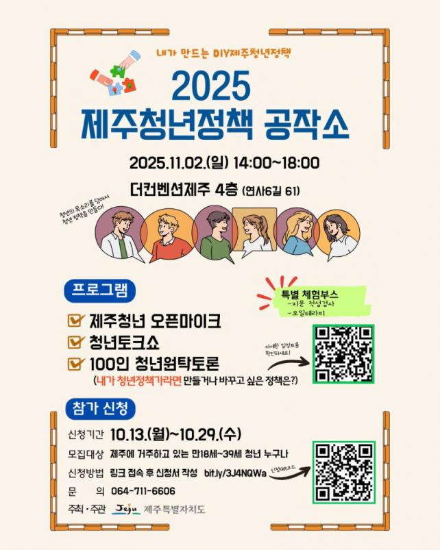 ¡®2025 Á¦ÁÖû³âÁ¤Ã¥°øÀÛ¼Ò¡¯´Â ¿À´Â 11¿ù 2ÀÏ ¿ÀÈÄ 2½Ã ´õÄÁº¥¼ÇÁ¦ÁÖ¿¡¼ °³ÃֵǸç, Á¦ÁÖ Ã»³âÁ¤Ã¥ÀÇ ÇöÀç¿Í ¹Ì·¡¸¦ ³íÇϰí û³âÀÌ Á÷Á¢ Á¤Ã¥ ¾ÆÀ̵ð¾î¸¦ ¹ß±¼¡¤Á¦¾ÈÇÏ´Â ÀÚ¸®·Î ¸¶·ÃµÆ´Ù. À̹ø Çà»ç´Â û³âÀÚÀ²¿¹»êÀÇ ³× ¹øÂ° »ç¾÷À¸·Î, Á¦3±â Á¦ÁÖû³âÀ§¿øµéÀÌ Âü¿©ÇÑ Á¦ÁÖû³âÁÖ±ÇȸÀÇ¿¡¼ ÀÇ°áµÆ´Ù.