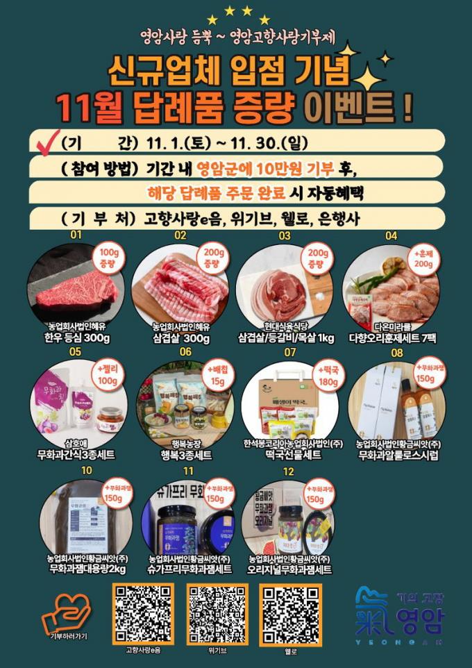 ÀÌ À̺¥Æ®¿¡¼´Â µî½É, »ï°ã»ì, ÈÆÁ¦¿À¸® µî À°·ù Á¦Ç°ºÎÅÍ °ï¾àÁ©¸®, ¹èĨ, ¹«È°ú °¡°ø½Äǰ, ¶±±¹ ¼±¹°¼¼Æ®±îÁö ´Ù¾çÇÑ Ç°¸ñÀÇ Áõ·® ÇýÅÃÀ» Á¦°øÇÑ´Ù.