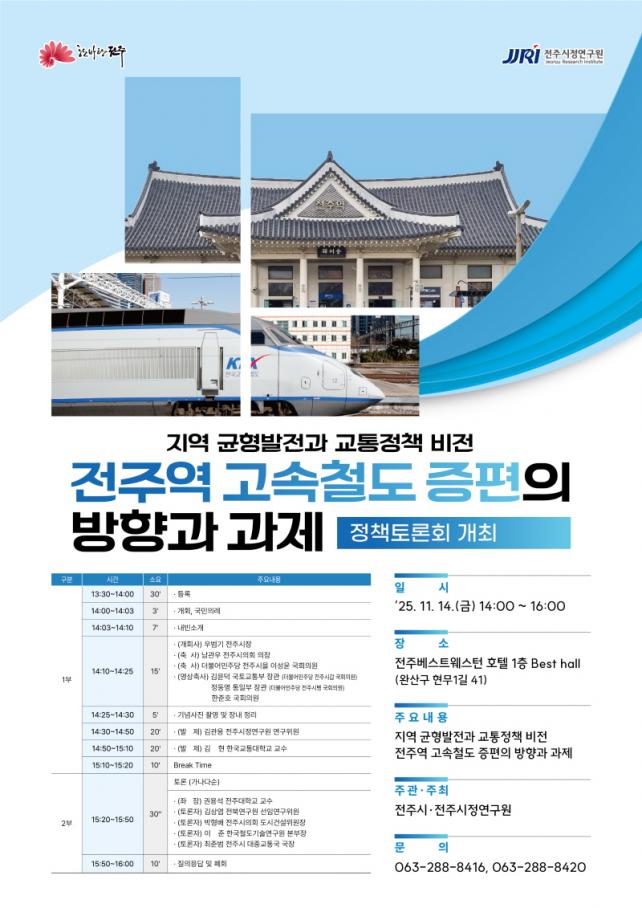 ÀüÁÖ½Ã¿Í ÀüÁÖ½ÃÁ¤¿¬±¸¿øÀº ¿À´Â 11¿ù 14ÀÏ ¿ÀÈÄ 2½Ã, º£½ºÆ®¿þ½ºÅÏÇ÷¯½º ÀüÁÖÈ£ÅÚ 1Ãþ º£½ºÆ®È¦(¿Ï»ê±¸ Çö¹«1±æ 41)¿¡¼­ ¡®Áö¿ª ±ÕÇü¹ßÀü°ú ±³ÅëÁ¤Ã¥ ºñÀü-ÀüÁÖ¿ª °í¼Óöµµ ÁõÆí ¹æÇâ°ú °úÁ¦¡¯¸¦ ÁÖÁ¦·Î Á¤Ã¥Åä·Ðȸ¸¦ °³ÃÖÇÑ´Ù.