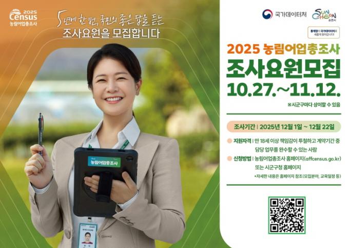 Á¶»ç¿ä¿ø ÀÀ½Ã ´ë»óÀº ¸¸ 18¼¼ ÀÌ»óÀ¸·Î Åë°è ¾÷¹«¿¡ Àü³äÇÒ ¼ö ÀÖ´Â »ç¸í°¨°ú Ã¥ÀÓ°¨ÀÌ ³ôÀº ÀÚÀ̸ç Á¶»ç ¹æ¹ýÀÌ Á¾ÀÌ Á¶»çÇ¥ ´ë½Å ÅÂºí¸´À» Ȱ¿ëÇÑ ÀüÀÚ Á¶»ç¹æ½ÄÀ¸·Î ½º¸¶Æ®±â±â »ç¿ë¿¡ ´É¼÷ÇØ¾ß ÇÑ´Ù. ¸ðÁý °ø°í´Â 2025 ³ó¸²¾î¾÷ÃÑÁ¶»ç ȨÆäÀÌÁö¿Í ¼øÃµ½Ã ȨÆäÀÌÁö¸¦ ÅëÇØ È®ÀÎÇÒ ¼ö ÀÖÀ¸¸ç, 11¿ù 12ÀϱîÁö ³ó¸²¾î¾÷ÃÑÁ¶»ç ȨÆäÀÌÁö ¶Ç´Â ¼øÃµ½Ã µðÁöÅÐÁ¤Ã¥°ú·Î ¹æ¹® Á¢¼öÇÏ¸é µÈ´Ù.