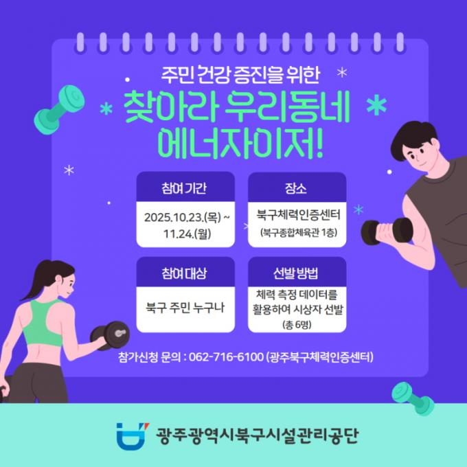 ¡®Ã£¾Æ¶ó ¿ì¸®µ¿³× ¿¡³ÊÀÚÀÌÀú!¡¯ 2±â ¼±¹ß´ëȸ´Â ¸¸ 19¼¼ ÀÌ»ó ºÏ±¸ ÁÖ¹ÎÀ̶ó¸é ´©±¸³ª Âü°¡ °¡´ÉÇϸç Âü°¡ºñ´Â ¹«·á´Ù. Âü°¡ÀÚµéÀº ±Ù·Â, Áö±¸·Â, ½ÉÆóÁö±¸·Â, À¯¿¬¼º, ¹Îø¼º, ¼ø¹ß·Â µî 6°³ Ç׸ñ¿¡ ´ëÇÑ Ã¼·ÂÃøÁ¤À» ¹Þ°Ô µÈ´Ù.