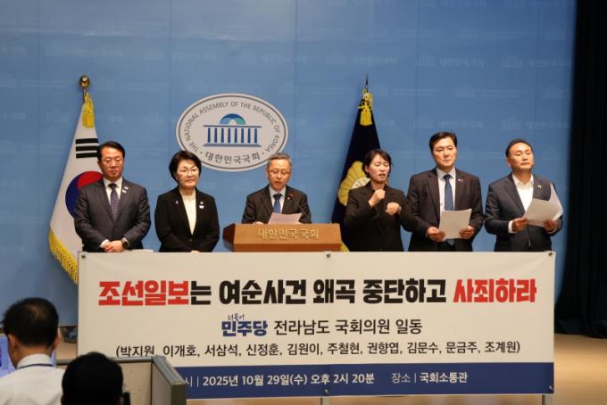 Àü³² Áö¿ª ¹ÎÁÖ´ç ÀÇ¿øµéÀº 29ÀÏ ±¹È¸ ¼ÒÅë°ü¿¡¼ ±âÀÚȸ°ßÀ» ¿°í ¡°Á¶¼±ÀϺ¸°¡ ¿©¼ø»ç°Ç 77Áֱ⸦ ¸Â¾Æ ´ëÅë·ÉÀÇ Ã߸ð ¸Þ½ÃÁö¸¦ ¿Ö°îÇϰí, Èñ»ýÀÚ¿Í À¯Á·ÀÇ ¸í¿¹¸¦ Áþ¹â¾Ò´Ù¡±°í ºñÆÇÇß´Ù.