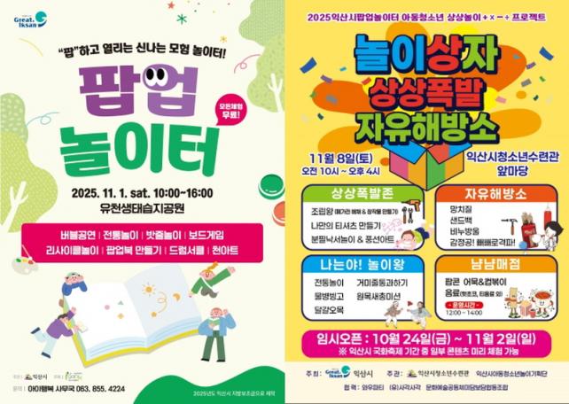 ÀÍ»ê½Ã´Â ¿À´Â 11¿ù 1Àϰú 8ÀÏ, ¾Æµ¿ÀÌ Á÷Á¢ »ó»óÇÏ°í ±âȹ¡¤¿î¿µ¿¡ Âü¿©ÇÏ´Â '2025 ÀÍ»ê½Ã ÆË¾÷³îÀÌÅÍ'¸¦ °³ÃÖÇÑ´Ù°í 30ÀÏ ¹àÇû´Ù.