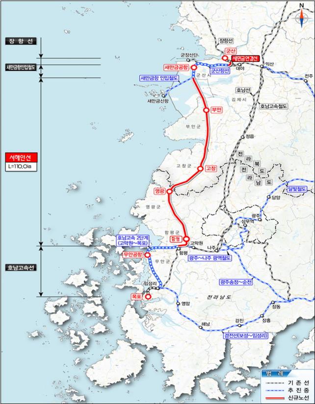 ¼­ÇؾÈöµµ ³ë¼±Àº ÃÑ ¿¬Àå 110km, ÃÑ»ç¾÷ºñ 4Á¶ 7919¾ï¿ø ±Ô¸ð·Î, ¼­Çؼ±(¼­È­¼º~È«¼º)°ú ÀåÇ×¼±(È«¼º~±º»ê), »õ¸¸±Ý¼±(±º»ê~»õ¸¸±Ý)À» ÀÕ´Â ¼­ÇØ¾È Ã¶µµÃàÀÇ ¸¶Áö¸· ´ÜÀý±¸°£À» ¸Þ¿ì´Â ÇÙ½É ±¸°£ÀÌ´Ù.±×·¯³ª ÇöÀç ±¹ÅäºÎÀÇ Á¦4Â÷ ±¹°¡Ã¶µµ¸Á±¸Ãà°èȹ(2021~2030³â)¿¡´Â ¼­ÇؾÈöµµ »ç¾÷ÀÌ ¡®Ãß°¡ °ËÅä»ç¾÷¡¯À¸·Î¸¸ µÇ¾îÀÖ¾î Á¦5Â÷ °èȹ(2026~2035³â)¿¡¼­´Â ¡®½Å±Ô »ç¾÷¡¯À¸·ÎÀÇ ¹Ý¿µÀÌ Àý½ÇÇÑ »óȲÀÌ´Ù.