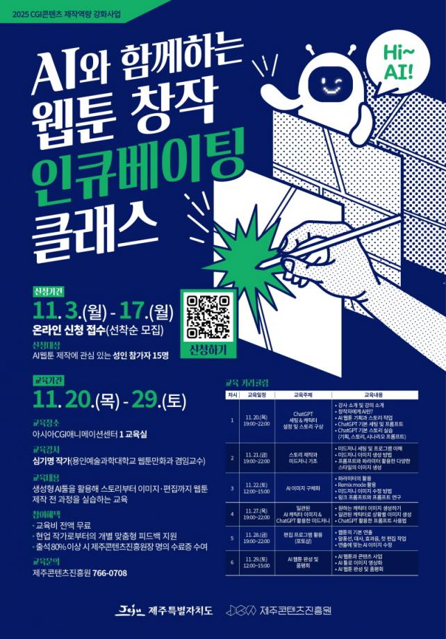 ±³À°Àº ¿À´Â 11¿ù 20ÀϺÎÅÍ 11¿ù 29ÀϱîÁö ÃÑ 6Â÷½Ã·Î ÁøÇàµÇ¸ç, 15¸íÀ» ¼±Âø¼øÀ¸·Î ¸ðÁýÇÑ´Ù. ¸ðÁý´ë»óÀº AI ÄÜÅÙÃ÷ Á¦ÀÛ¿¡ °ü½É ÀÖ´Â ¼ºÀÎ ´©±¸³ª Âü¿©ÇÒ ¼ö ÀÖÀ¸¸ç, Á¢¼ö´Â 11¿ù 3ÀÏ(¿ù)ºÎÅÍ 11¿ù 17ÀÏ(¿ù) ¿ÀÈÄ 5½Ã±îÁö ±¸±Û Æû(https://forms.gle/C7Rfv4pVMUCB3R4dA) ¶Ç´Â Æ÷½ºÅÍÀÇ QRÄڵ带 ÅëÇØ ½Åû °¡´ÉÇÏ´Ù. Âü°¡ºñ´Â ¹«·á´Ù.