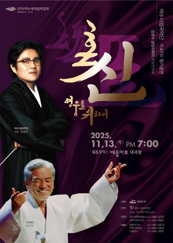 ¿©¼ö½Ã¸³±¹¾Ç´ÜÀº À̹ø ¹«´ë¸¦ ÅëÇØ ¡®¿µ¿õ¡¯¿¡ ´ëÇÑ »õ·Î¿î ½Ã°¢À» À½¾ÇÀ¸·Î Ç®¾î³»¸ç ½Ã¹Îµé¿¡°Ô ±íÀº ¿ï¸²°ú °¨µ¿À» ¼±»çÇÒ ¿¹Á¤ÀÌ´Ù.