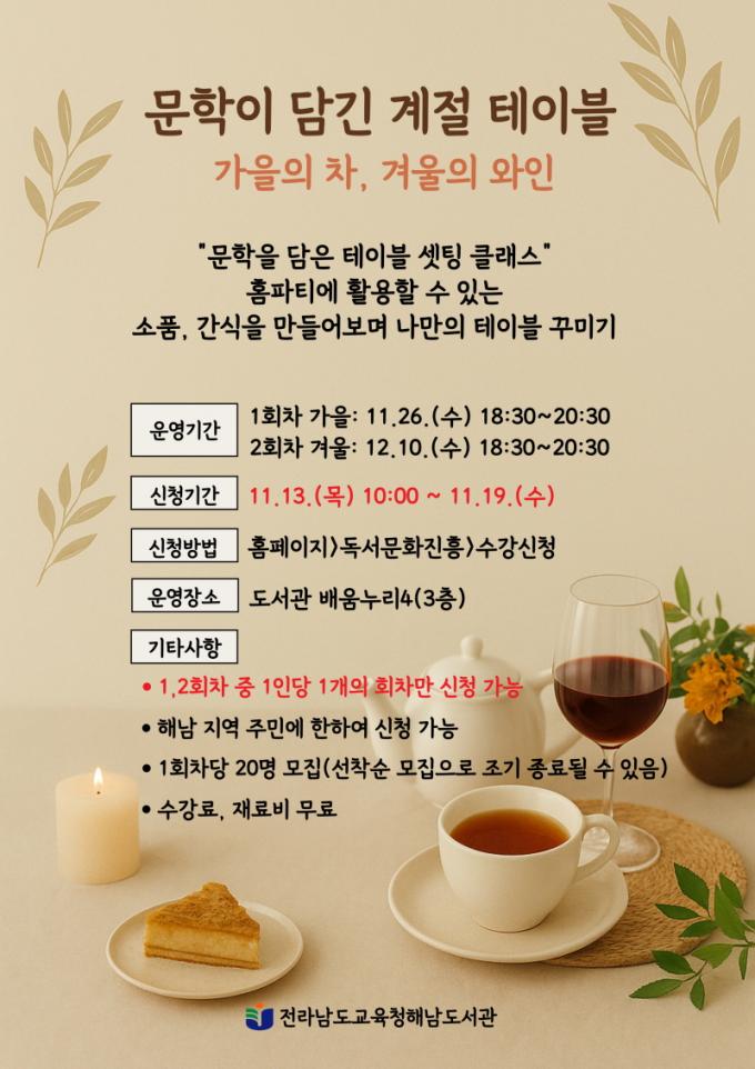 ¼ö° ½ÅûÀº 11¿ù 13ÀϺÎÅÍ 11¿ù 19ÀϱîÁö ÇØ³²µµ¼°ü ´©¸®ÁýÀ» ÅëÇØ ¼±Âø¼øÀ¸·Î ¹Þ´Â´Ù. ¸ðÁý ÀοøÀº Á¤¿ø¿¡ µû¶ó Á¶±â ¸¶°¨µÉ ¼ö ÀÖ´Ù. ÀÚ¼¼ÇÑ ³»¿ëÀº µµ¼°ü ´©¸®Áý(hnlib.jne.go.kr) ¶Ç´Â ÀüÈ(061-537-2483)·Î ¹®ÀÇÇÏ¸é µÈ´Ù.