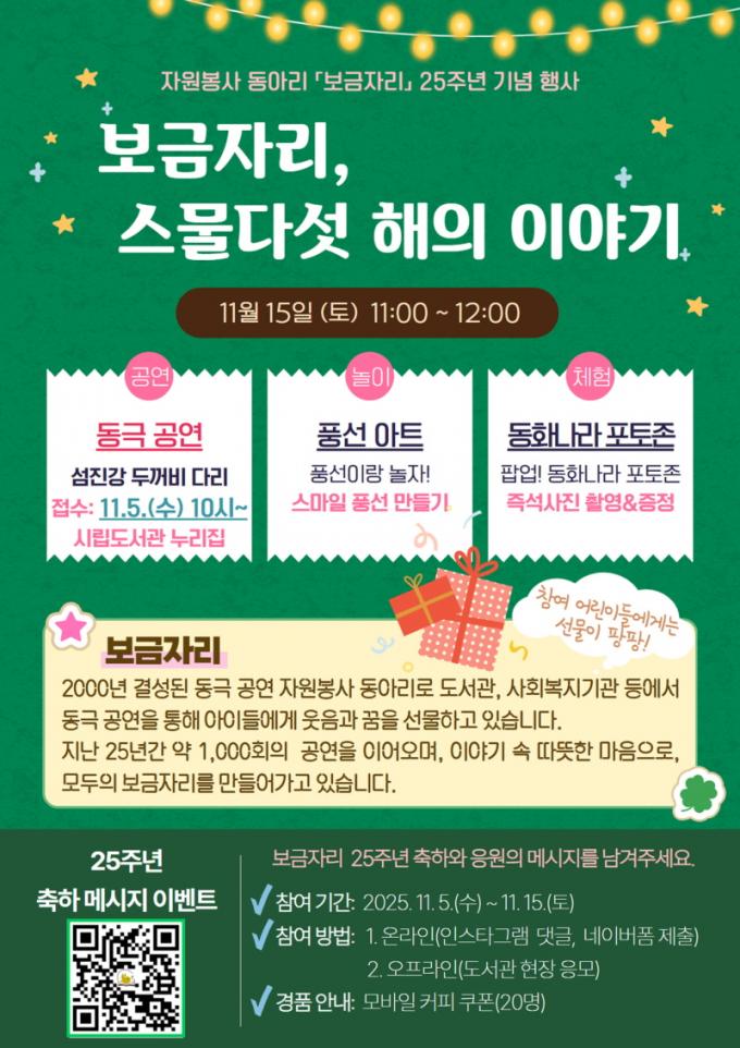 ¶ÇÇÑ, ¡®º¸±ÝÀÚ¸®¡¯ °á¼º 25Áֳ⡸ÃàÇϸ޽ÃÁö À̺¥Æ®¡¹µµ ÇÔ²² ÁøÇàµÈ´Ù. ÀÀ¿ø°ú ÃàÇÏÀÇ ¸Þ½ÃÁö¸¦ ³²±ä ½Ã¹Î Áß Ãß÷À» ÅëÇØ ¼ÒÁ¤ÀÇ ¼±¹°À» ÁõÁ¤ÇÒ ¿¹Á¤ÀÌ´Ù.