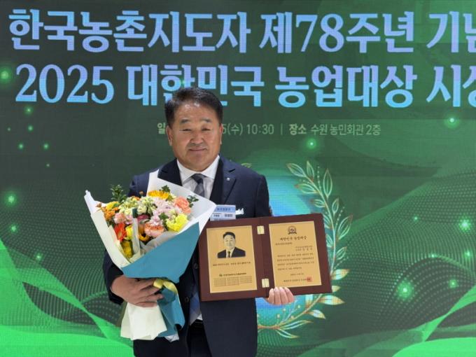 [È£³²µµ¹Î½Å¹® = ÀÓÀ±Áø ±âÀÚ] °­¼º¹Î ¼­Áøµµ³óÇù Á¶ÇÕÀåÀÌ 11¿ù 5ÀÏ °æ±âµµ ¼ö¿øÆ¯·Ê½Ã ³ó¹Îȸ°ü¿¡¼­ ¿­¸° ¡®2025 ´ëÇѹα¹ ³ó¾÷´ë»ó¡¯ ½Ã»ó½Ä¿¡¼­ ³ó»ê¾÷ ºÐ¾ß ÃÖ¿ì¼ö»óÀ» ¼ö»óÇß´Ù.