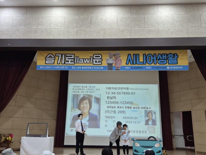 À̳¯ ±¤Áַּθó·ÎÆÄÅ©(¼¾ÅÍÀå ¼ÒÂù¿µ)´Â Çѱ¹µµ·Î±³Åë°ø´Ü ±¤ÁÖÀü³²ÁöºÎÀÇ ±³Åë¹ý±Ô Àü¹®°¡ ¹Ú¼öÁø±³¼ö¸¦ ÃʺùÇÏ¿© ¾î¸£½ÅµéÀ» ´ë»óÀ¸·Î ±³Åë°ü·Ã ¹ý±Ô¿Í ±³Åë»ç°í ¿¹¹æ ¹æ¹ý ¹× °í·ÉÀÚÀÇ ¿îÀü¸éÇãÁõ ¹Ý³³Á¦µµ µî¿¡ ´ëÇØ ¼³¸íÇß´Ù.