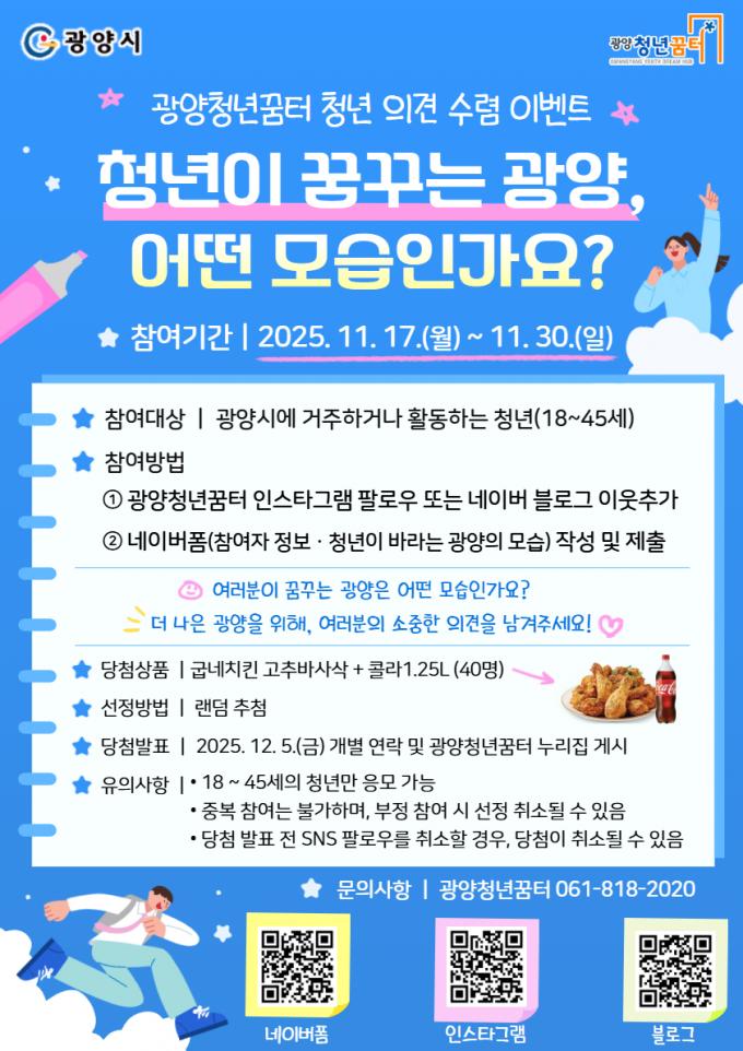Âü¿© ´ë»óÀº ±¤¾ç½Ã¿¡ °ÅÁÖÇϰųª ±¤¾ç½Ã¿¡¼ Ȱµ¿Çϰí ÀÖ´Â 18¼¼~45¼¼ ÀÌÇÏ Ã»³âÀÌ´Ù. Âü¿© ¹æ¹ýÀº ±¤¾çû³â²ÞÅÍ °ø½Ä SNS(³×À̹ö ºí·Î±×¡¤ÀνºÅ¸±×·¥) Áß ÇÑ °÷À» ÆÈ·Î¿ìÇÑ µÚ, ¡®Ã»³âÀÌ ¹Ù¶ó´Â ±¤¾çÀÇ ¸ð½À¡¯À» ÀÚÀ¯·Ó°Ô ÀÛ¼ºÇØ ÆÈ·Î¿ì ÀÎÁõ°ú ÇÔ²² ³×À̹öÆûÀ¸·Î Á¦ÃâÇÏ¸é µÈ´Ù.