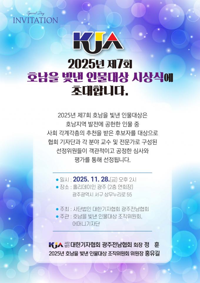 [È£³²µµ¹Î½Å¹® = ÀÓÀ±Áø ±âÀÚ] »ç´Ü¹ýÀÎ ´ëÇѱâÀÚÇùȸ ±¤ÁÖ¡¤Àü³²Çùȸ(ȸÀå Á¤ÈÆ)°¡ ¡®2025³â Á¦7ȸ È£³²À» ºû³½ Àι°´ë»ó¡¯ ¼ö»óÀÚ ¸í´ÜÀ» È®Á¤¡¤¹ßÇ¥Çß´Ù.