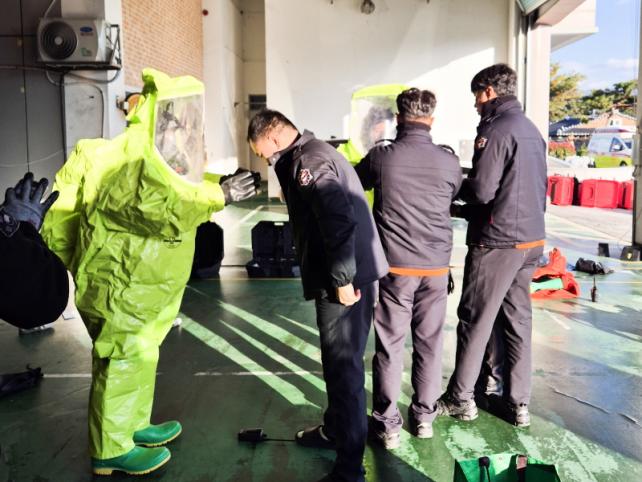 ÀÌ¿¡ °æÂû, ¼Ò¹æ, º¸°Ç µî Ãʵ¿´ëÀÀ±â°ü °£´ãȸ¸¦ ÅëÇØ »ý¹°Å×·¯ Àǽɻç°Ç ½Å°í ½Ã ´ëÀÀ ÀýÂ÷¿Í Ãʵ¿Á¶Ä¡ ±â°üº° ¿ªÇÒ µî »óȲ´ëó¹æ¾È¿¡ ´ëÇØ ³íÀÇÇϸç Çù·Âü°è¸¦ ±¸ÃàÇÏ¿´À¸¸ç, ÀÌ¾î¼ º¸°Ç¼Ò Ãʵ¿´ëÀÀ¿ä¿øÀ» ´ë»óÀ¸·Î °³ÀÎ º¸È£º¹(Level A)ÀÇ Âø¡¤Å»ÀÇ ¹æ¹ý°ú °ø±âÈ£Èí±â »ç¿ë¹ý µî ½Ç½À ±³À°À» ½Ç½ÃÇØ ÇöÀå´ëÀÀ´É·ÂÀ» °ÈÇß´Ù.