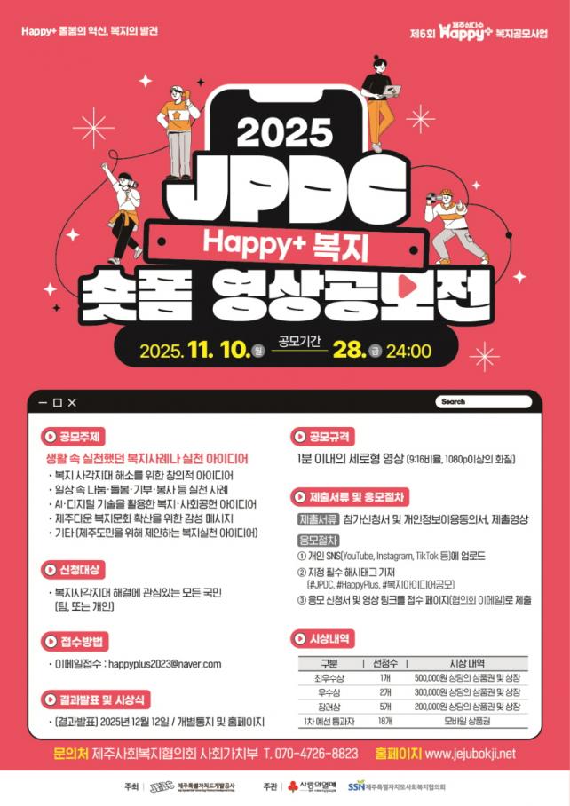 Á¦ÁÖÆ¯º°ÀÚÄ¡µµ°³¹ß°ø»ç(»çÀå ¹é°æÈÆ)´Â Á¦ÁÖµµ»çȸº¹ÁöÇùÀÇȸ(ȸÀå °í½ÂÈ), Á¦ÁÖ»çȸº¹Áö°øµ¿¸ð±Ýȸ(ȸÀå °Áö¾ð)¿Í ÇÔ²² ¿À´Â 11¿ù 28ÀϱîÁö ¡®2025³â JPDC Happy+º¹Áö ¼ôÆû¿µ»ó °ø¸ðÀü¡¯À» °³ÃÖÇÑ´Ù°í ¹àÇû´Ù.