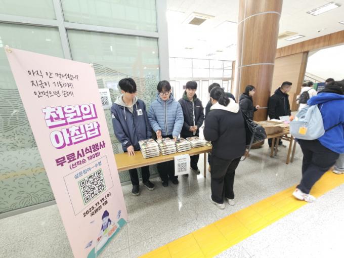 ¿ÃÇØ 12¿ù 18ÀÏ(¸ñ)±îÁö ¿î¿µµÇ´Â ¡®Ãµ¿øÀÇ ¾ÆÄ§¹ä¡¯ »ç¾÷Àº ³ó¸²Ãà»ê½ÄǰºÎ, ³ó¸²¼ö»ê½Äǰ±³À°¹®ÈÁ¤º¸¿ø, ÁöÀÚü, ´ëÇÐÀÌ ÇÔ²² ºñ¿ëÀ» ºÎ´ãÇØ Çлýµé¿¡°Ô ¾ÆÄ§ ½Ä»ç¸¦ õ¿ø¿¡ Á¦°øÇÏ´Â »ç¾÷ÀÌ´Ù.