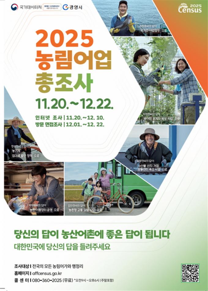±¤¾ç½Ã Á¶»ç ´ë»óÀº 2025³â 12¿ù 1ÀÏ ±âÁØ ³ó¸²¾î¾÷¿¡ Ȱµ¿ÇÏ´Â 13,527°¡±¸´Ù. Á¶»ç´Â ºñ´ë¸é ¹æ½ÄÀÌ ¿ì¼± ÁøÇàµÈ´Ù. 11¿ù 20ÀϺÎÅÍ 12¿ù 10ÀϱîÁö ÈÞ´ëÀüÈ­·Î QRÄڵ带 ½ºÄµÇϰųª, ÀÎÅͳݡ¤¸ð¹ÙÀÏÀ» ÅëÇØ ±¹°¡µ¥ÀÌÅÍó Á¶»ç ȨÆäÀÌÁö(www.affcensus.go.kr)¿¡ Á¢¼ÓÇØ ¾È³»¹®¿¡ ±âÀçµÈ Âü¿©¹øÈ£¸¦ ÀÔ·ÂÇÏ¸é µÈ´Ù. ÀüÈ­ Âü¿©´Â Äݼ¾ÅÍ(¢Ï 080-360-2025)¸¦ ÅëÇØ °¡´ÉÇÏ´Ù.