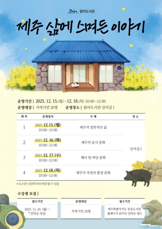 ÇÁ·Î±×·¥ Âü¿©¸¦ Èñ¸ÁÇÏ´Â ½Ã¹ÎÀº 11¿ù 24ÀϺÎÅÍ Á¦ÁÖÆ¯º°ÀÚÄ¡µµ °ø°øµµ¼°ü ´©¸®Áý(https://www.jeju.go.kr/lib)¢¡ Çà»ç/ÇÁ·Î±×·¥¢¡ µµ¼°ü ÇÁ·Î±×·¥ ½ÅûÀ» ÅëÇØ Á¢¼öÇÒ ¼ö ÀÖ´Ù. ±âŸ ÀÚ¼¼ÇÑ »çÇ×Àº ޶󵵼°ü(¢Ï064-728-8373)À¸·Î ¹®ÀÇÇÏ¸é ¾È³»¹ÞÀ» ¼ö ÀÖ´Ù.