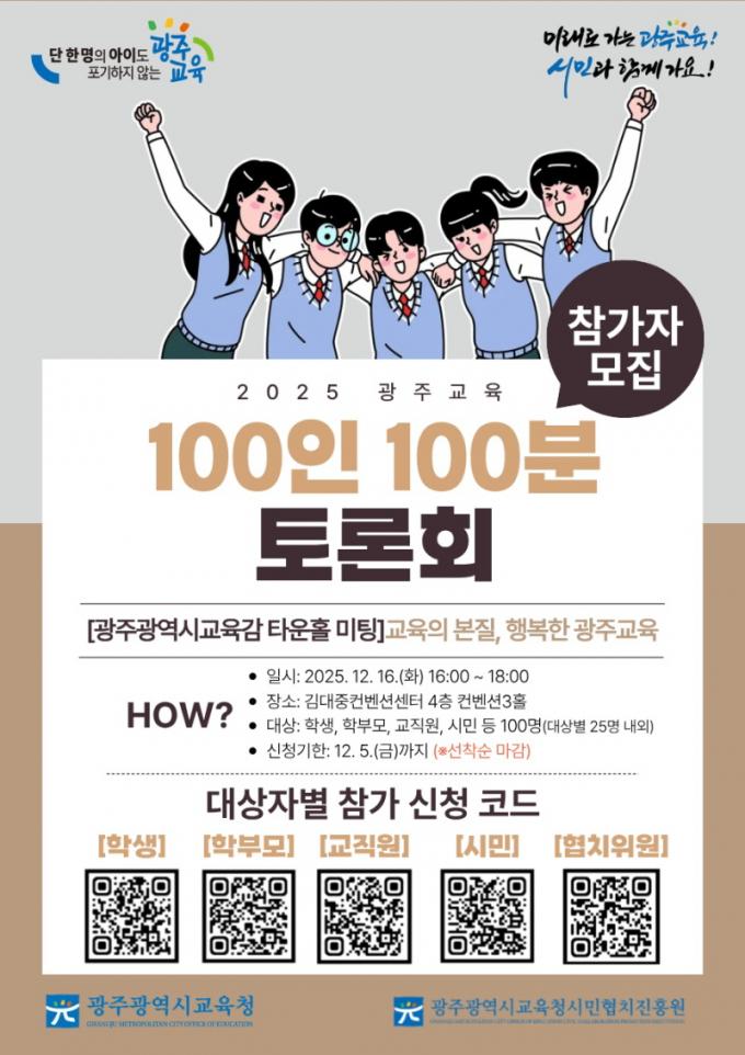 ±¤ÁÖ±³À°¿¡ °ü½ÉÀÌ ÀÖ´Â Çлý¡¤Çкθ𡤱³Á÷¿ø¡¤½Ã¹Î(½Ã¹Î´Üü ¹× ±¤ÁÖ±³À°ÇùÄ¡À§¿ø Æ÷ÇÔ)Àº ´©±¸³ª Âü¿©ÇÒ ¼ö ÀÖ´Ù. ½ÅûÀº Æ÷½ºÅÍ QRÄÚµå ¶Ç´Â ¿Â¶óÀÎ ½Åû ¸µÅ©(ÇÏ´Ü ÂüÁ¶)¿¡¼ ÇÏ¸é µÈ´Ù. ÀÚ¼¼ÇÑ ³»¿ëÀº ½Ã¹ÎÇùÄ¡ÁøÈï¿ø ±âÈÄȯ°æ°ú(062-712-6711)·Î ¹®ÀÇÇÏ¸é µÈ´Ù.