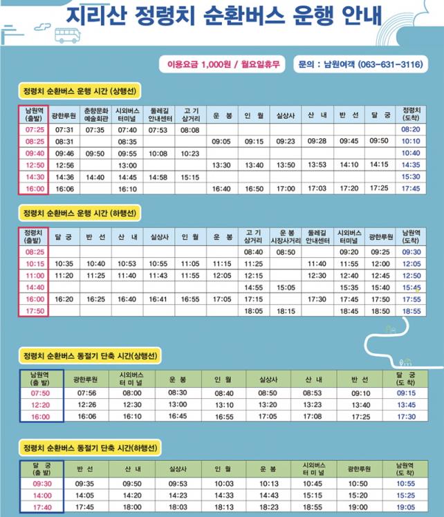Á¤·ÉÄ¡ ¼øÈ¯¹ö½º´Â ³²¿ø¿ªÀ» Ãâ¹ßÇØ Áö¸®»ê Á¤·ÉÄ¡±îÁö À̾îÁö´Â °ü±¤ ¼ÅƲ¹ö½º·Î, 2019³â ù ¿îÇàÀ» ½ÃÀÛÇÑ ÀÌÈÄ ¸Å³â À̿밴ÀÌ Áõ°¡Çϸç Áö¸®»ê °ü±¤ Ȱ¼ºÈ­¿¡ Å« ¿ªÇÒÀ» ÇØ¿Ô´Ù. ¿ÃÇØ¸¸ ÇØµµ 11,000¿© ¸íÀÇ °ü±¤°´°ú ½Ã¹ÎÀÌ ¼øÈ¯¹ö½º¸¦ ÀÌ¿ëÇØ Áö¸®»êÀ» ã´Â µî Áö¿ª °ü±¤»ê¾÷ ¹ßÀüÀÇ Áß¿äÇÑ ±³Åë ±â¹ÝÀ¸·Î ÀÚ¸® Àâ°í ÀÖ´Ù.