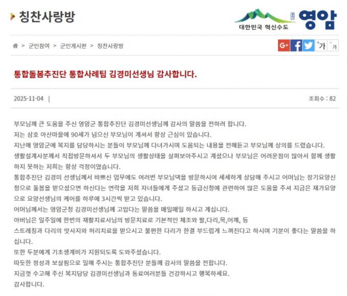 ¿ÃÇØ 1¿ùºÎÅÍ´Â ¿µ¾Ï±ºÀÌ »ç·Ê°ü¸® ´ë»óÀ¸·Î ÁöÁ¤ÇØ, ¹Ø¹ÝÂù Áö¿øÀ» ½ÃÀÛÀ¸·Î Àå±â¿ä¾ç¼ºñ½º, ±º¹Î ´©±¸³ª µ¹º½ µ¿Çà ¼ºñ½º¸¦ Æ÷ÇÔÇØ °æÁ¦¡¤°Ç°¡¤µ¹º½ µî ºÐ¾ß·Î ³ª´² °ü¸®ÇØ ¿À°í ÀÖ´Ù. ƯÈ÷, ÅëÇÕ»ç·Ê°ü¸®»çÀÇ °³ÀÔ ÀÌÈÄ °¡Á¤ÀÌ Ã³ÇÑ º¹ÇÕ ¹®Á¦¸¦ Áö¿ª»çȸ¿Í ÇÔ²² Ç®¾î ±âÃÊ»ýȰ¼ö±ÞÀÚ·Î ¼±Á¤Çß´Ù.