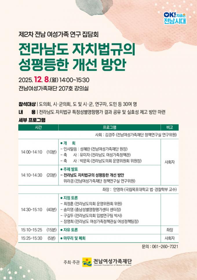 Åä·Ðȸ¿¡¼´Â Àü³²¿©¼º°¡Á·Àç´Ü À§¶ó°â ¿¬±¸À§¿øÀÌ ¡¸Àü¶ó³²µµ ÀÚÄ¡¹ý±ÔÀÇ ¼ºÆòµîÇÑ °³¼± ¹æ¾È¡¹À» ÁÖÁ¦·Î ¿¬±¸ °á°ú¸¦ ¹ßÇ¥Çϰí À̾î ÁöÁ¤Åä·ÐÀÌ ÁøÇàµÈ´Ù. Åä·ÐÀڷδ Àü¶ó³²µµÀÇȸ ¿î¿µÀ§¿øÈ¸ ÃÖÁ¤ÈÆ À§¿ø, Ãæ³²¼ºº°¿µÇâÆò°¡¼¾ÅÍ ¼Û¹Ì¿µ ¼¾ÅÍÀå, Àü¶ó³²µµÀÇȸ ÀÔ¹ý¿¬±¸ÆÀ ±¸±æµÎ ¹Ú»ç, Àü¶ó³²µµ ¿©¼º°¡Á·Á¤Ã¥°ü½Ç Àå¸íÈñ ¿©¼ºÁ¤Ã¥ÆÀÀåÀÌ ³ª¼±´Ù.
