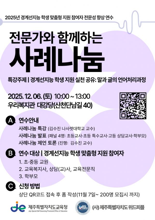 Áö³ 7¿ùºÎÅÍ¡®°æ°è¼±Áö´É Çлý ÀÌÇØ ¹× ±³½ÇÁö¿ø Àü·«¡¯À» ÁÖÁ¦·Î ÃÊ¡¤Áßµî ±³»ç¿Í ±³À°º¹Áö»ç, »ó´ã±³»ç, º¸È£ÀÚ µî 150¿© ¸íÀ» ´ë»óÀ¸·Î ÃÑ 8Â÷·Ê ¿î¿µµÇ°í ÀÖÀ¸¸ç °æ°è¼±Áö´É ÇлýÀÇ Æ¯¼º°ú ÇнÀ ȯ°æ ÀÌÇØºÎÅÍ ÀÛ¾÷±â¾ï¡¤¹®ÇØ·Â Çâ»ó, Á¤¼¡¤Çൿ ÁßÀç ¹æ¾È±îÁö ±³À° ÇöÀå¿¡¼ ¹Ù·Î Àû¿ëÇÒ ¼ö ÀÖ´Â ³»¿ëÀ» »ç·Ê Á᫐ °ÀÇ¿Í ½Ç½ÀÀ¸·Î Á¦°øÇß´Ù.