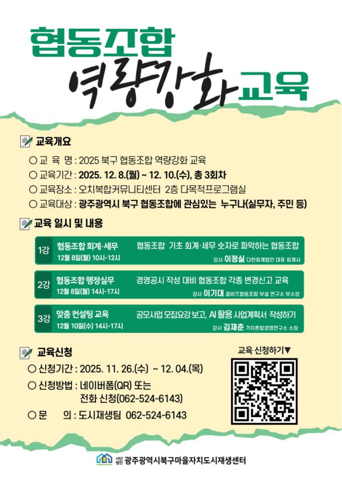 ´ë»óÀº ºÏ±¸ ¼ÒÀç ¸¶À»°ü¸®»çȸÀûÇùµ¿Á¶ÇÕÀ» Æ÷ÇÔÇÑ Çùµ¿Á¶ÇÕ ½Ç¹«ÀÚ 30¸í ³»¿ÜÀ̸ç, Âü¿© ½ÅûÀº 11¿ù 26ÀϺÎÅÍ 12¿ù 4ÀϱîÁö ³×À̹öÆû(https://naver.me/II47B5W6) ¶Ç´Â ÀüÈ(062-524-6143)¸¦ ÅëÇØ ½ÅûÇÒ ¼ö ÀÖ´Ù.
