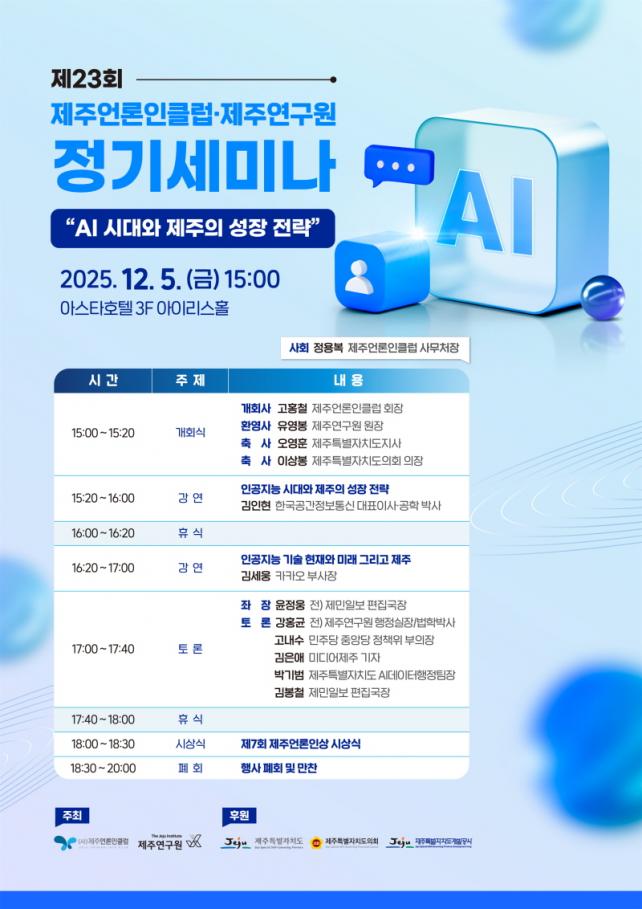 ÀÌÈÄ À±Á¤¿õ Àü Á¦¹ÎÀϺ¸ ÆíÁý±¹ÀåÀÌ ÁÂÀåÀ» ¸Ã¾Æ ½Éµµ ÀÖ´Â Åä·ÐÀ» ÁøÇàÇÑ´Ù. Åä·Ð¿¡´Â °È«±Õ Àü Á¦ÁÖ¿¬±¸¿ø ÇàÁ¤½ÇÀå, °í³»¼ö ¹ÎÁÖ´ç Áß¾Ó´ç Á¤Ã¥À§ ºÎÀÇÀå, ±èÀº¾Ö ¹Ìµð¾îÁ¦ÁÖ ±âÀÚ, ¹Ú±â¹ü Á¦ÁÖÆ¯º°ÀÚÄ¡µµ AIµ¥ÀÌÅÍÇàÁ¤ÆÀÀå, ±èºÀö Á¦¹ÎÀϺ¸ ÆíÁý±¹ÀåÀÌ Âü¿©ÇØ AI ½Ã´ë¿¡ ÇÊ¿äÇÑ Á¦ÁÖÀÇ Á¤Ã¥ ¹æÇâ, Áö¿ª »ê¾÷°ú ÀÏÀÚ¸® º¯È, ¾ð·ÐÀÇ ¿ªÇÒ µî Æø³ÐÀº ÀǰßÀ» Á¦½ÃÇÒ ¿¹Á¤ÀÌ´Ù.