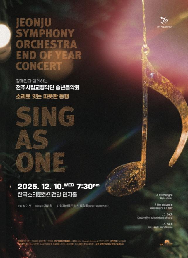 ÀüÁֽø³±³Çâ¾Ç´ÜÀº ¿À´Â 10ÀÏ ¿ÀÈÄ 7½Ã 30ºÐ, Çѱ¹¼Ò¸®¹®ÈÀÇÀü´ç ¿¬ÁöȦ¿¡¼ Àå¾ÖÀΰú ÇÔ²²ÇÏ´Â ¼Û³âÀ½¾Çȸ ¡®¼Ò¸®·Î ÀÕ´Â µû¶æÇÑ µ¿Çà(Sing as One)¡¯À» ¼±º¸ÀδÙ.