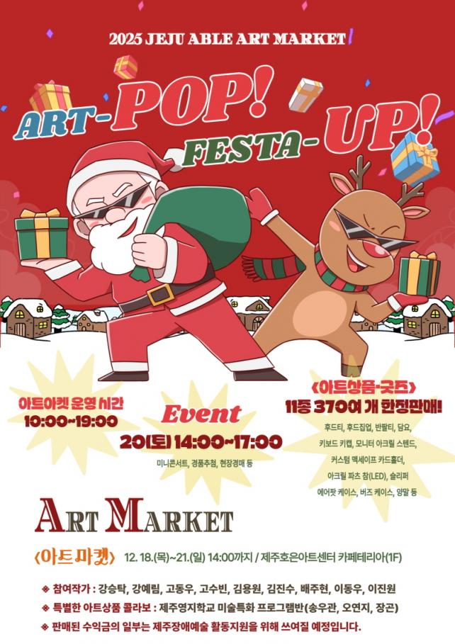ÇÔ²² ÁøÇàµÇ´Â¡®2025 Á¦ÁÖ¿¡ÀÌºí¾ÆÆ®¸¶ÄÏ¡¯Àº È£Àº¾ÆÆ®¼¾ÅÍ 1Ãþ Ä«ÆäÅ׸®¾Æ¿¡¼ 12¿ù 18ÀÏ(¸ñ)ºÎÅÍ 21ÀÏ(ÀÏ) 14½Ã±îÁö ¿î¿µµÈ´Ù. ¿ÃÇØ´Â ÆË¾÷½ºÅä¾î ÇüÅ·Π±¸¼ºµÇ¸ç, Á¦ÁÖ¸¦ ´ëÇ¥ÇÏ´Â ¹ß´ÞÀå¾Ö û³â ÀÛ°¡(°½ÂŹ, °¿¹¸², °íµ¿¿ì, °í¼öºó, ±è¿ë¿ø, ±èÁø¼ö, ¹èÁÖÇö, À̵¿¿ì, ÀÌÁø¿ø)ÀÇ Ã¢ÀÛ ±â¹Ý ±ÂÁî 11Á¾ 370¿© Á¡°ú ¾ÆÆ®ÇÁ¸°ÆÃ ÀÛǰ, ¿øÈ ±×¸²µéÀÌ ÇÑÁ¤ ÆÇ¸ÅµÈ´Ù.